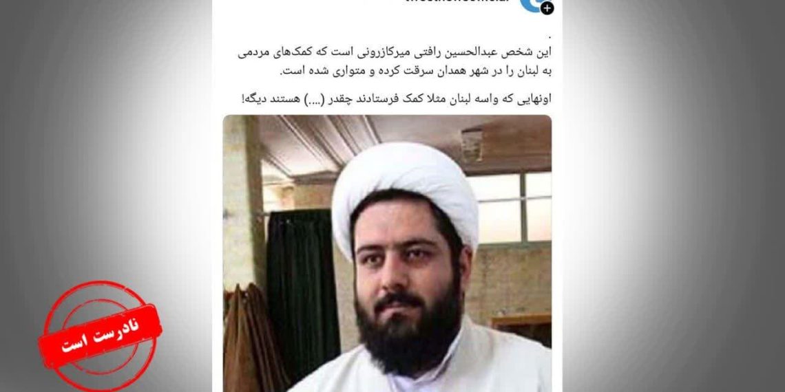 به گزارش خبر۲۴، در روز های گذشته برخی اکانت ها در صفحات مجازی ، با انتشار ویدئویی مدعی شدند یک روحانی همدانی به نام عبدالحسین رآفتی میرکازرونی کمکهای مردم همدان به لبنان را دزدیده و ناپدید شده است. مشابه این ادعا نیز در هفته های اخیر درباره کمکهای مردم کرج به لبنان، درباره طلبه ای به نام حجتالاسلام شمقدری وایرال شده بود. بررسیهای گروه راستیآزمایی پایگاه خبری تحلیلی رواج۲۴، نشان میدهد این ادعا از اساس نادرست است، بنا بر اعلام مسئولان حوزه علمیه همدان، چنین فردی وجود خارجی ندارد و عکس منتشر شده هم مربوط به یک طلبه همدانی به نام رحیم حضرتی است که در حوزه علمیه همدان مشغول تبلیغ و تحصیل است و هیچ مسئولیتی در دفتر نماینده ولی فقیه در استان ندارد. بنابراین ادعای وجود فردی با مشخصات عبدالحسین رآفتی میرکازرونی و ماجرای فرار او با کمک های اهدایی همدانی ها به مردم لبنان، نادرست است.