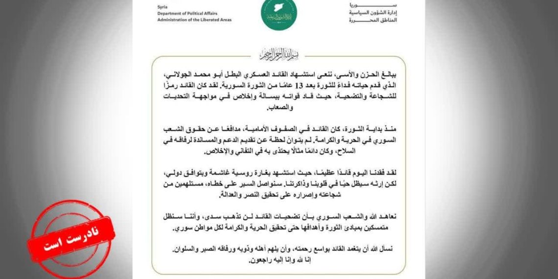 به گزارش خبر۲۴، در ساعات اخیر تصویری منتشر شده که ادعا شده بیانیه گروهک تروریستی تحریر الشام برای به هلاکت رسیدن الجولانی است. بررسیهای گروه راستی آزمایی رواج۲۴، نشان میدهد که این تصویر متعلق به گروهک تروریستی تحریر الشام نیست. علاوه بر این، تنها چند رسانه اقدام به انتشار آن کردند که بعد از انتشار، این بیانیه از خروجی آن ها حذف شد. بنابراین اگرچه هنوز به هلاکت رسیدن الجولانی در رسانههای گمانه زنی میشود اما، تصویر فوق جعلی است.